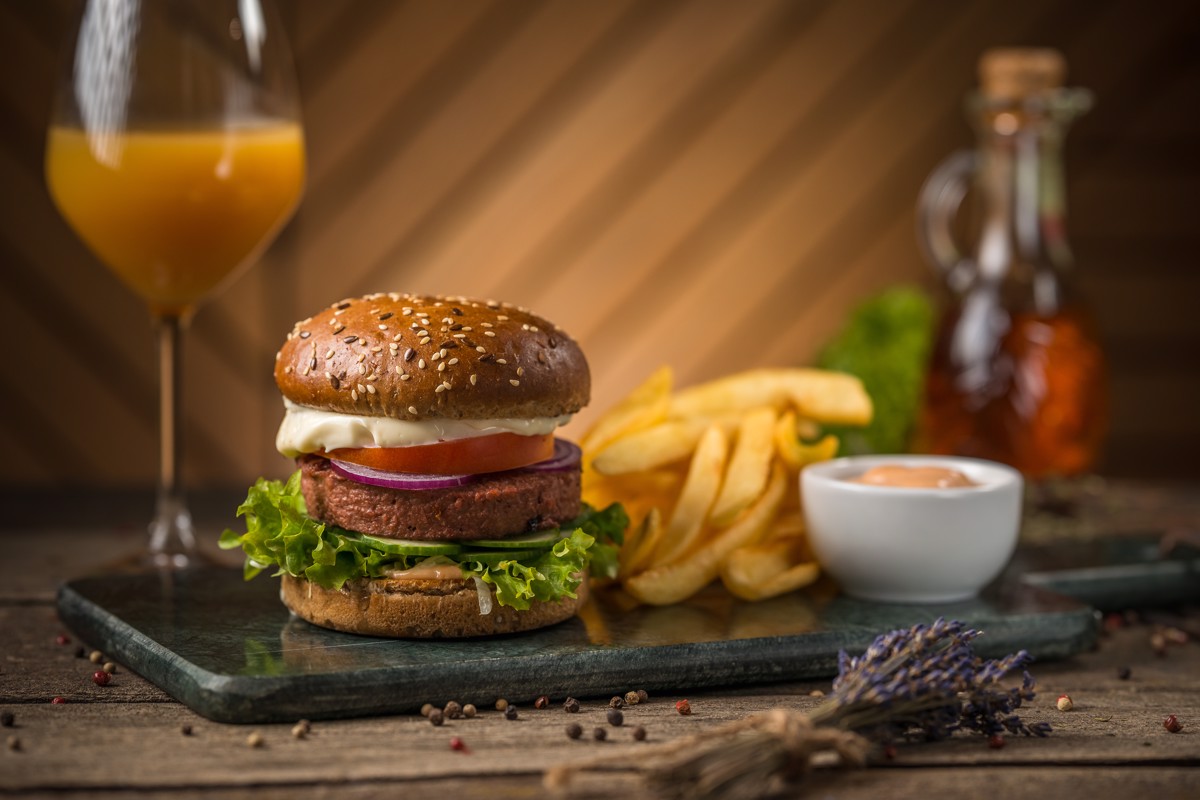 "Vegan Fresh Burger" burger, fry'n dip potatoes (150 gr), vegan mayonnaise sauce, drink of your choice. 410 gr.