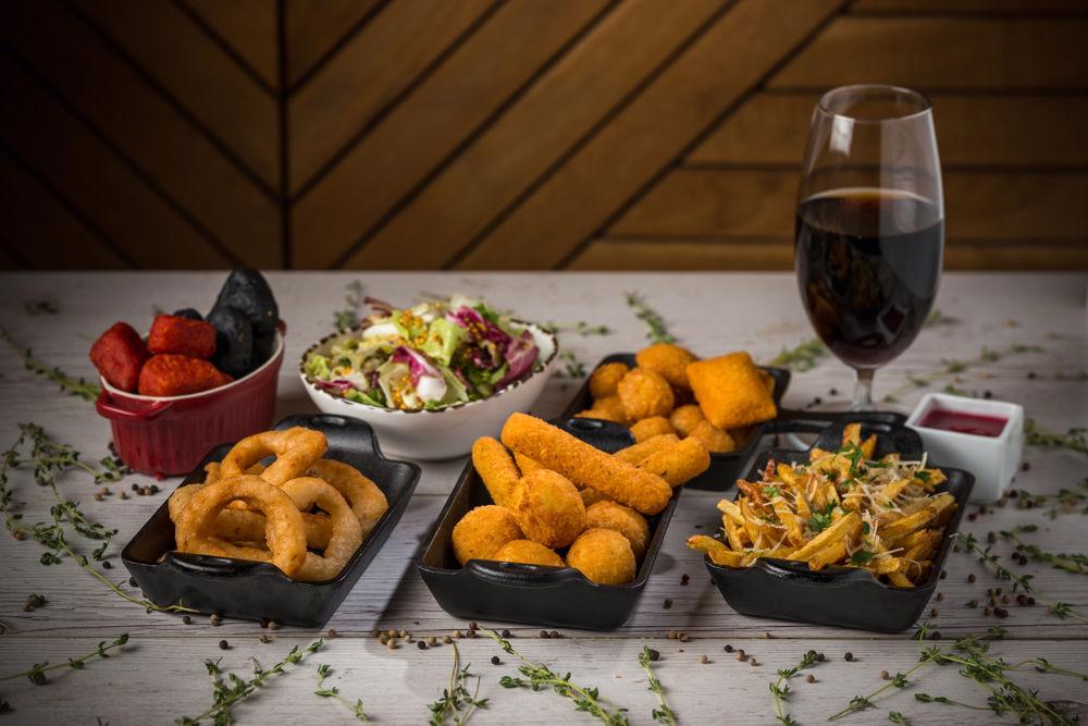 4x mozzarela sticks, 4x jalapeno snacks, 4x philadelphia snacks, 4x bites black, 4x bites red, 4x gouda snacks, 6x inele de ceapa + 400 g cartofi prajiti cu parmezan si usturoi+ sos + bautura racoritoare 900 g