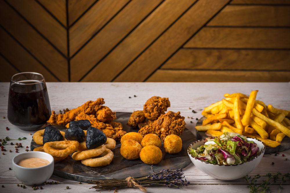 4x Piept de pui crocant, 4x aripioare crocante, 6x Philadelphia snacks, 4x bites black, 4x bites red, 6x inele de ceapa + 400 g cartofi prajiti + salata mixta + sos + bautura racoritoare 900 g
