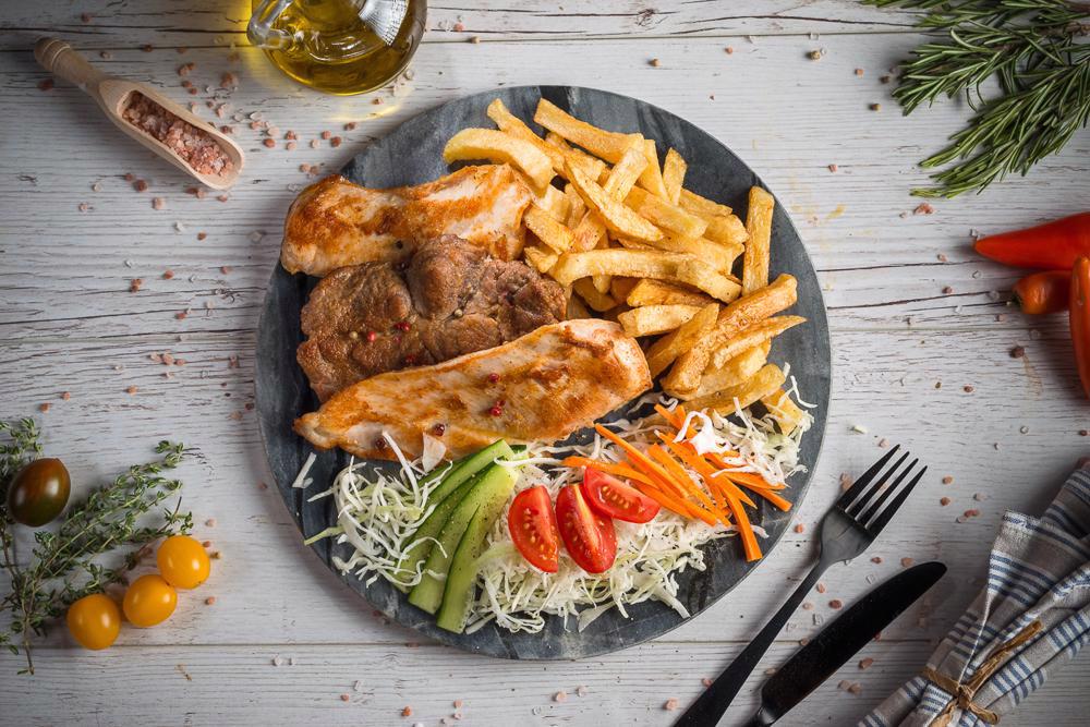 Ingrediente: 1 x buc. ceafa porc la gratar, 2 x buc. piept pui la gratar, 1 x cartofi naturali prajiti sau orez cu legume, 1 x salata asortata de varza, 1 x sos la alegere, 1 x suc sau bere. 790 g
