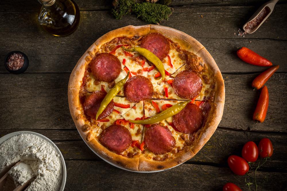 Ingrediente: Sos de rosii, salam, mozzarella, ardei gras, ardei iute 670 g