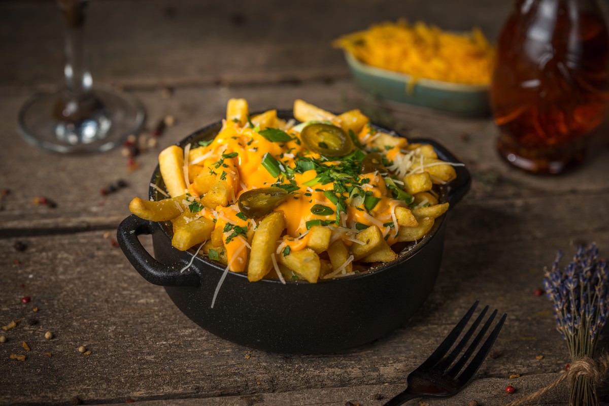 Cartofi prajiti (200 gr) + sos ceddar + ceapa verde + patrunjel.
