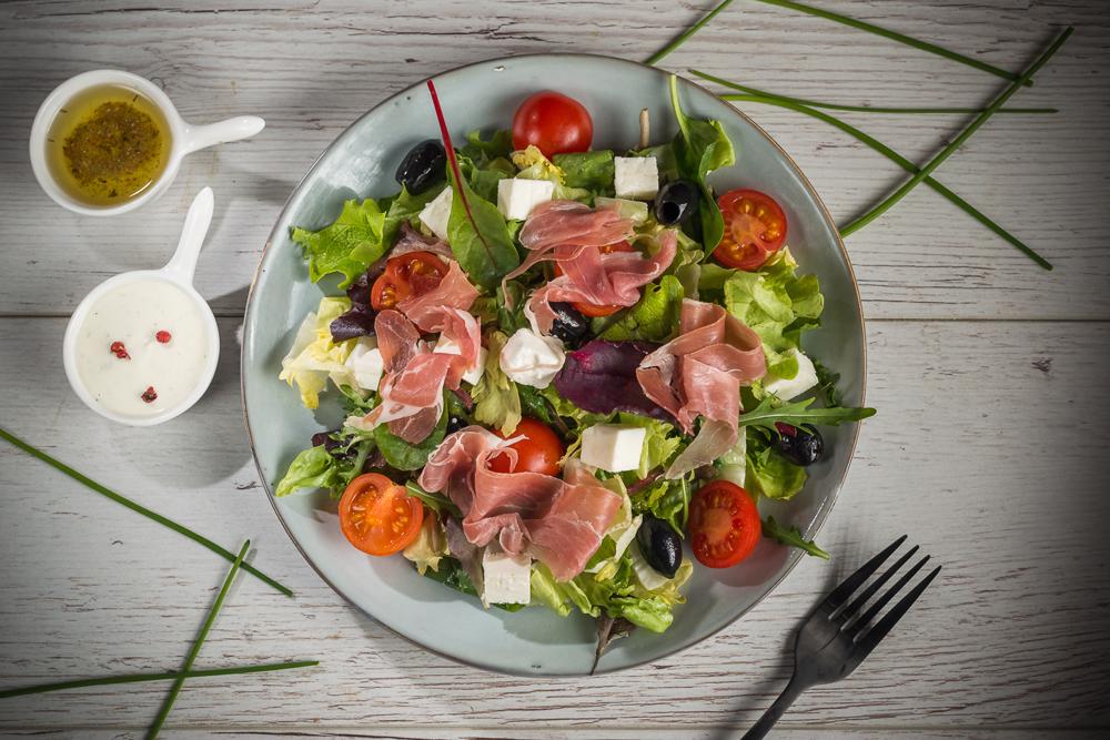 Ingrediente: mixt salata - rosii cherry - masline - branza feta - otet balsamic - prosciutto crudo - ulei masline + dressing 420 g
